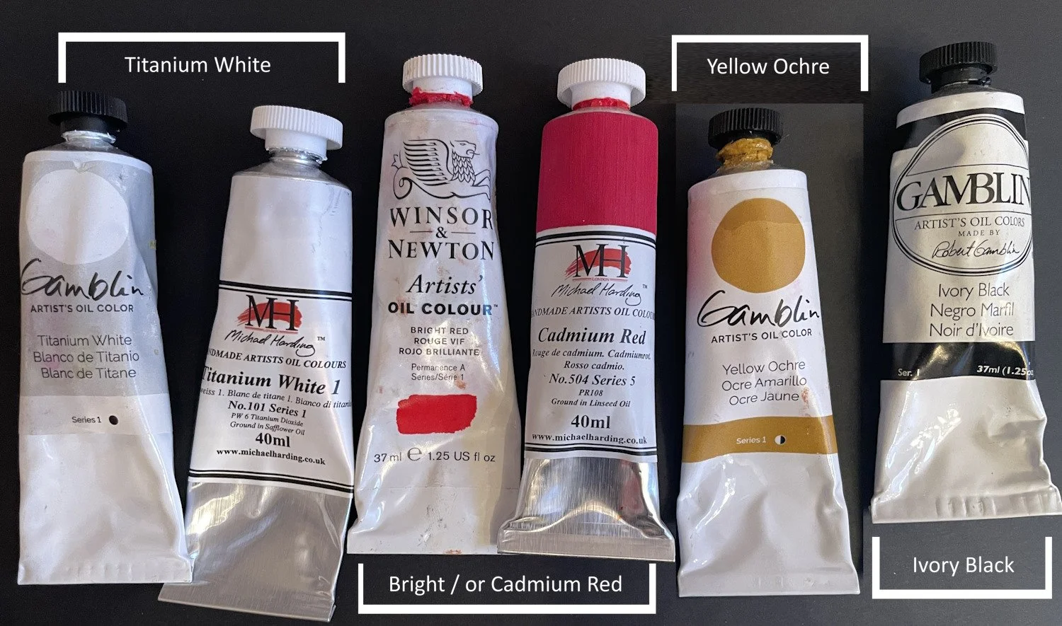 Titanium White, Bright or Cadmium Red, Yellow Ochre and Ivory Black Oil Paint